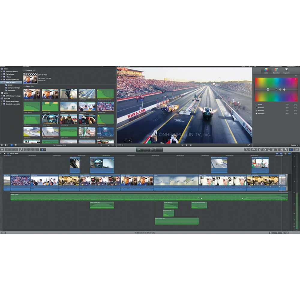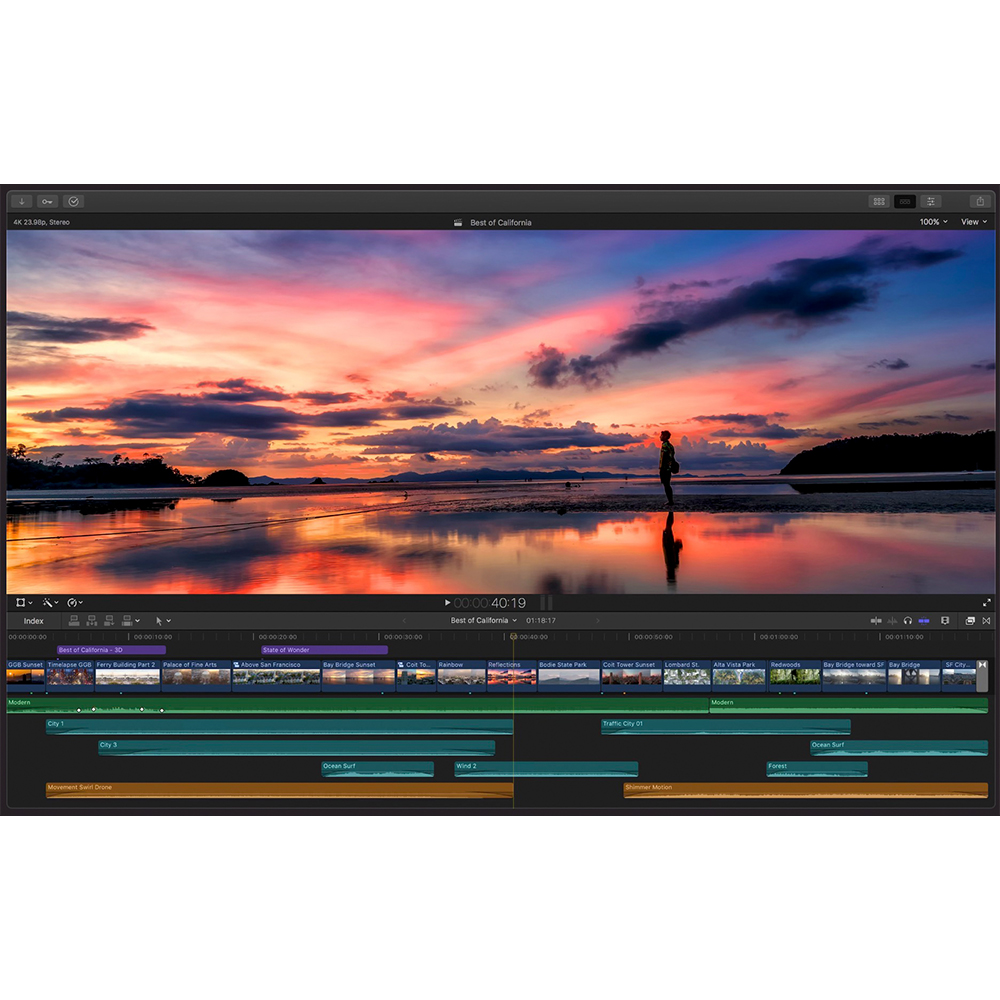 The Magnetic Timeline allows you to easily experiment with story ideas by moving and trimming clips without collisions or sync problems. Use Compound Clips to bundle separate video and audio clips into a single movable package, create Auditions to try out multiple takes in the timeline, and use Synchronized Clips to align video with second-source audio automatically. Color coding makes it easy to identify different types of content, with the ability to customize the look of your timeline while you edit.